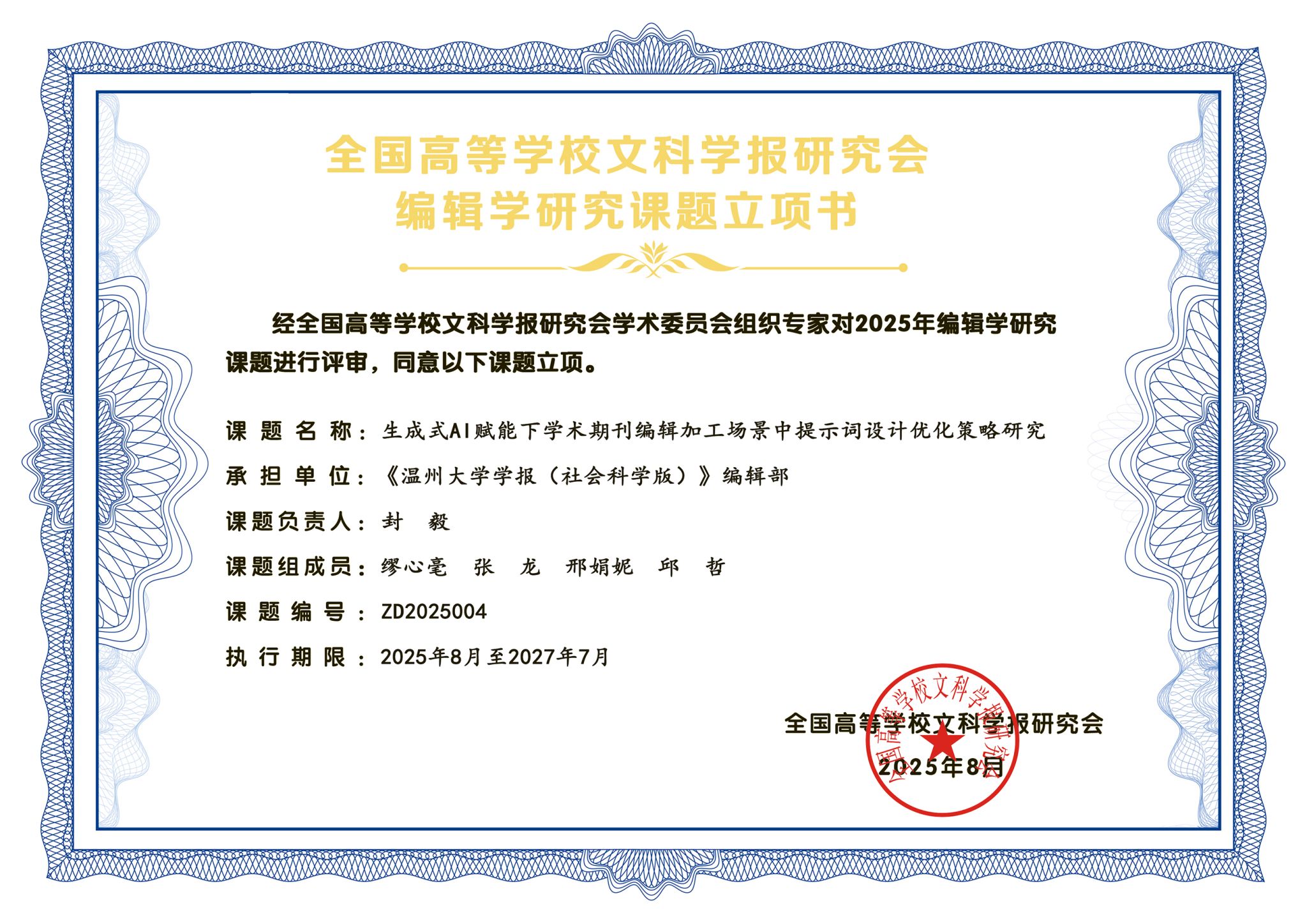 全国高等学校文科学报研究会为国家一级学会,汇聚近千家高校文科学报与期刊单位,其年度研究基金项目代表我国人文社科学术期刊研究的最高水平。本年度共收到申报课题283项,经专家分组评审、集体评议,仅21项获评重点项目。此次项目获批,彰显了期刊社编辑在编辑学理论创新与技术融合研究方面的领先实力。