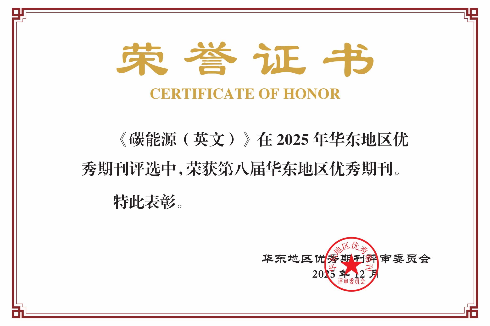 来源:期刊社 浏览次数: 发布时间:2025-12-22近日,第八届华东地区优秀期刊推荐活动入围名单正式公布,经华东地区各省(市)期刊协会初评推荐、华东地区优秀期刊评审委员会终评审议通过,我校《碳能源(英文)》《温州大学学报(社会科学版)》被评为第八届华东地区优秀期刊。